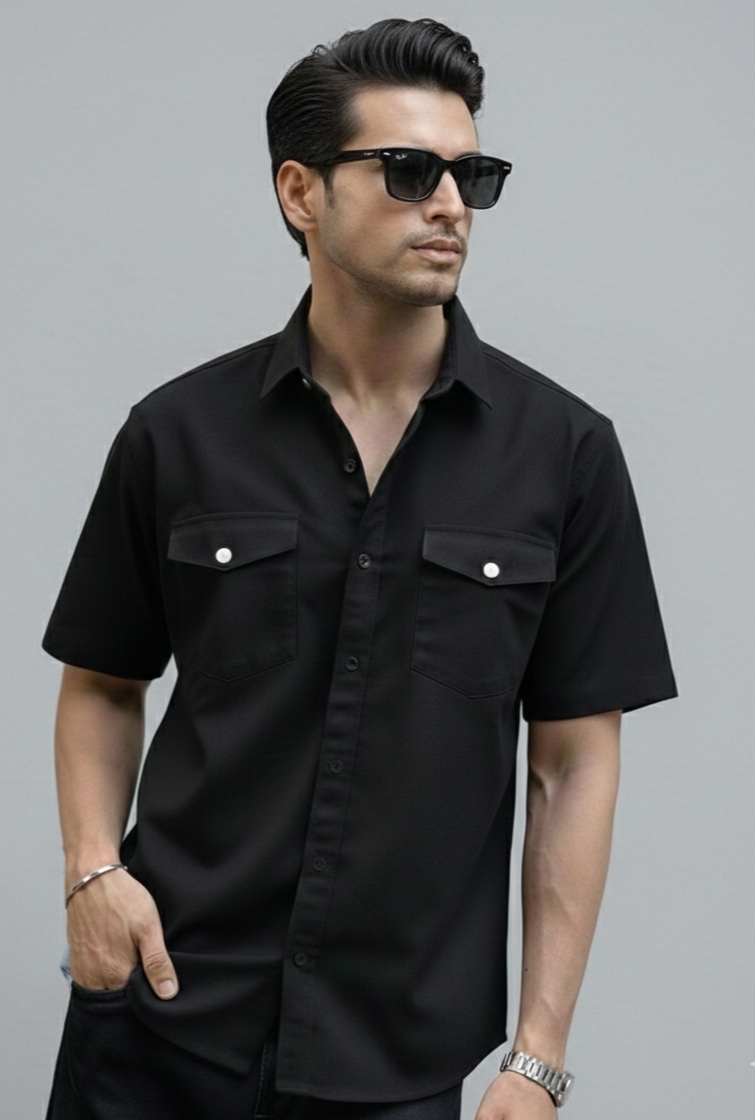 Minimal, sharp, and effortlessly cool this black short-sleeve shirt is built for modern everyday wear. The shirt features two front flap pockets with metal snap details, adding subtle character while keeping the design streamlined.